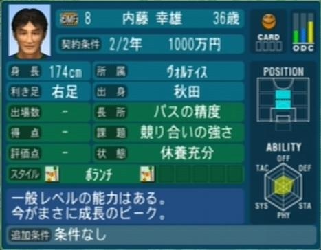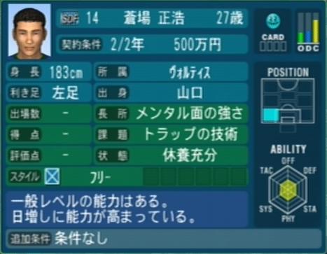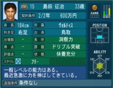 シーズンの半分過ぎた時点でレギュラーFWの2人が移籍したこともあってか、初年度は最下位に終わりました。おもに留学地、キャンプ地確保のために資金を使い、補強も移籍した選手の穴を埋める程度だったので、チーム力そのものはあまり上がっていない状態。ゲームオーバーにならない程度の補強をしておくべきだったかなぁ・・・とちょっと来期が不安。1年目 クラブデータ