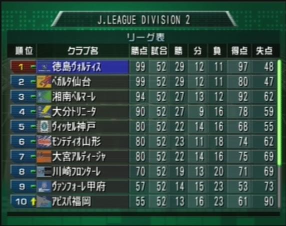- 最終節に敗戦し勝点で並ぶも得失差でJ2優勝